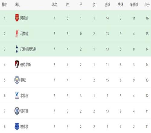 英超已经进行了7轮,在争冠集团中并没有表现极其出色的球队,前5的球队差距都很小。榜首球队是阿森纳,5胜1平1负,拿到了16分。排名第2的是利物浦,拿到15分,只落后1分。热刺和伯恩茅斯都是14分。排名第5的是曼城,拿到13分,也仅仅落后榜首的阿森纳3分而已。至于曼联,成绩还是不理想,3胜1平3负,只拿到10分,排第10。