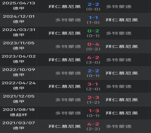 此外,双方近10次各项赛事交锋,拜仁占据上风,取得6胜3平1负的战绩。数据显示,自2021年3月以来,在双方的10次碰撞中,多特仅赢下1场。