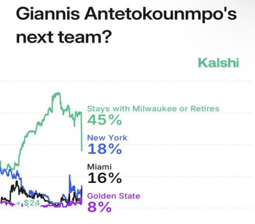 外媒Kaishi显示,字母哥留队概率降至45%,也就是说他离队的概率已经达到55%,其中,尼克斯获得字母哥的概率是18%,热火是16%,勇士8%。